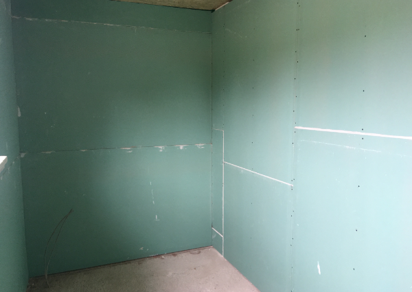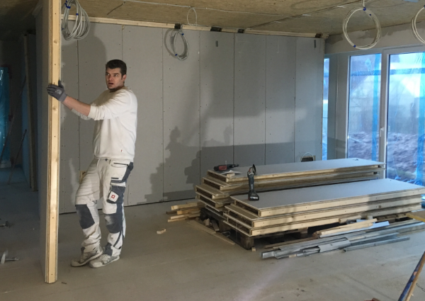 • Trockenbauwände als FLUDO-Wände mit 12 mm OSB-Platte und 12,5 mm Gipskartonplatte als Wandaufbau, innen mit Dämmung.