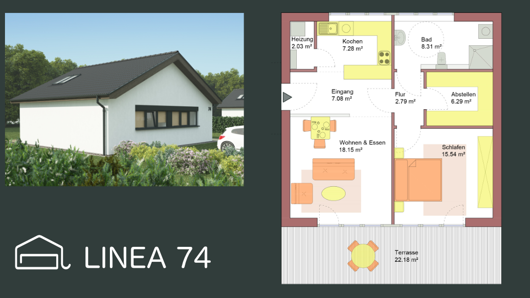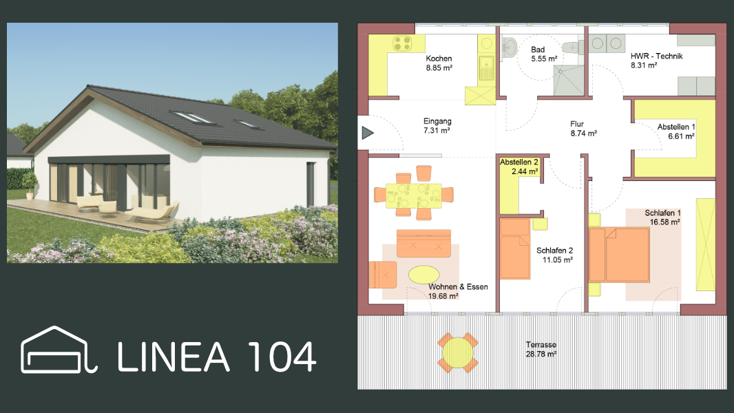 Der Grundriss des LINEA 104 ist hervorragend geeignet für Familien mit Kind oder Paare, die ein Büro, Gästezimmer oder Hobbyraum zusätzlich zu schätzen wissen. Natürlich kann der Grundriss gemäß Ihren Wünschen angepasst und optimiert werden.