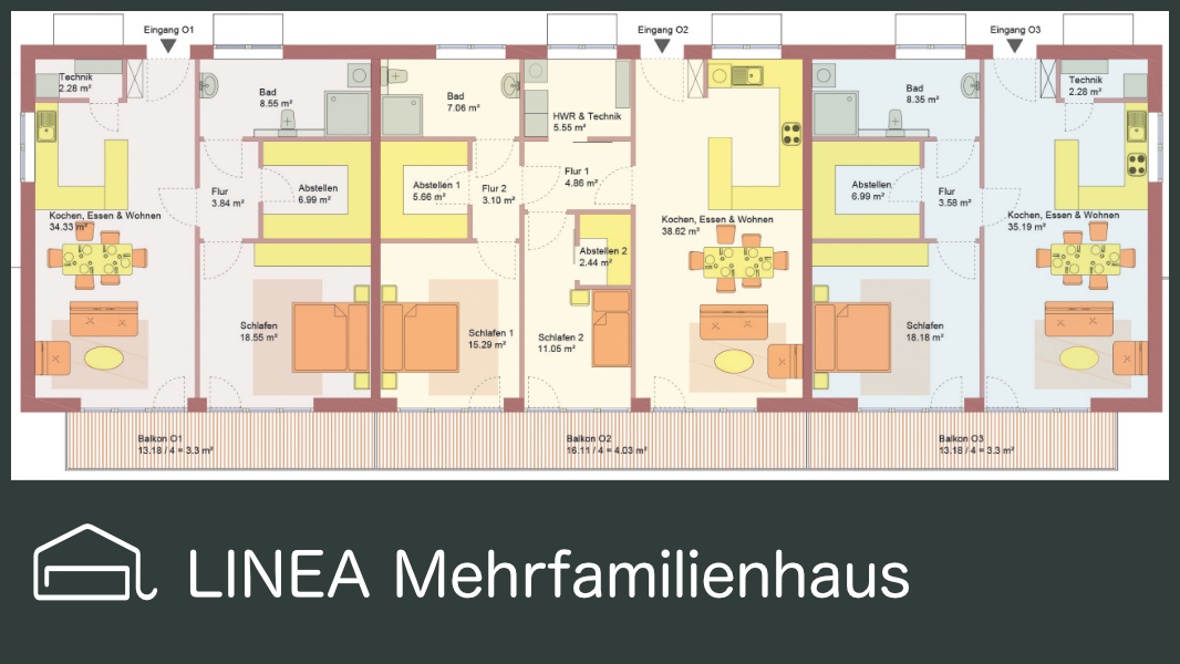 Kombinieren Sie die verschiedenen Wohnungsgrößen von 34 bis 104 qm in einem Mehrfamilienhaus. So erreichen Sie einen hervorragenden Größenmix für alle Anforderungen.